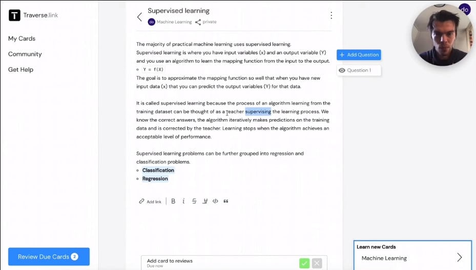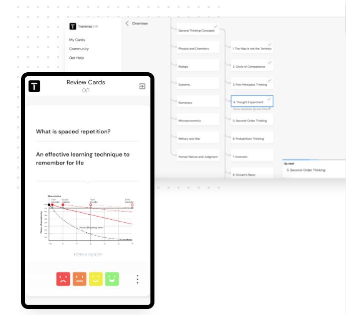Now let’s check what’s the major point of this program. Traverse allows users to learn the information with spaced repetition flashcards. All the users should add review questions to the material. If you forget the content of a particular flashcard, the program will show it.